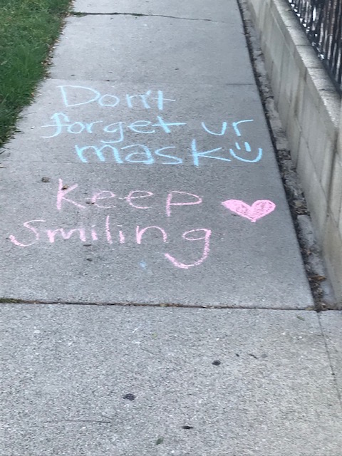 On those early morning walks, I take heart from the pictures on the sidewalk, the neighbors and children reaching out to each other, and yet I wonder whether or not this is yet another form of that privilege, that power, that comfort. I don’t know. It makes me feel better, like we are “all in this together” as the Mayor insists, but are we? I try to be a good person, to tip anyone who delivers anything, to make masks for those who need them, but I wonder whether or not I am simply lured into a false sense of security by seeing that children are still coloring, that people care for one another…